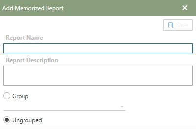 •Memorize Report: Choose this option to add this saved report settings to the Memorized Reports in Report Center. Define a Report Name, Report Description, and choose an existing group or un-group it. Click the save option once a Report Name has been defined and ready to be saved.